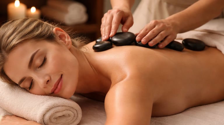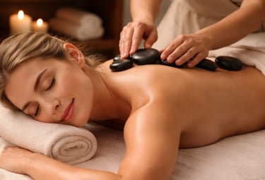 Masaje profundo con piedras calientes que relaja la musculatura, alivia tensiones y aporta una sensación de calma total.